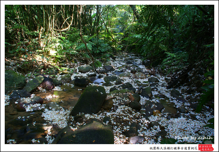 這幾次賞桐花都沒有發現桐花滿地的畫面,心裡頭有點不甘心,於是5/2一早先去公司處理相關事情之後,再度背起相機前往大溪尋找桐花;這回拜訪的地方是大溪境內著名的登山健行路線─打鐵寮古道。這打鐵寮古道全長相當長,一路可以從大溪三層地區行經後慈湖可抵達百吉隧道,沿途山勢起伏算是有一點點難度,而這次走古道不是重點,重點是尋找賞花的景點。一入古道就發現山區油桐花盛開,整個山頭白色油桐花纏聚,可見目前大溪仍是賞桐花最佳時機,不久我獨行山區小徑之後,終於發現桐花落滿整個小徑的畫面,心裡頭開始雀躍不已,繼續前進雖然小徑不易行走,但是突然柳暗花明又一村的驚喜,這驚喜就是發現一條小溪,小溪上落滿桐花,心裡頭便給他一個桐花溪的美稱,剎那間感覺到前面難走的小徑堅持下去是值得的,今天終於拍到今年度桐花密度最高的景點,對我來說今年的桐花我沒錯過!